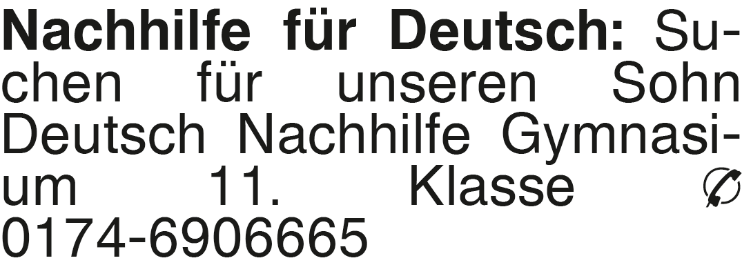 Nachhilfe für Deutsch: Su Suchen für unseren Sohn Deutsch Nachhilfe Gymnasium 11. Klasse Tel. 0174-6906665Kontakt