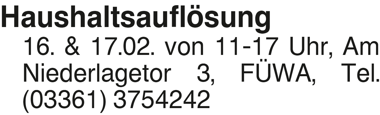 Haushaltsauflösung 16. & 16. & 17.02. von 11-17 Uhr, Am Niederlagetor 3, FÜWA, Tel. (03361) 3754242Das könnte Sie auch interessieren
