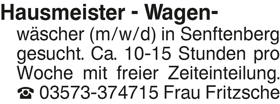 Hausmeister - Wagenwäscher Hausmeister - Wagen- wäscher (m/w/d) in Senftenberg gesucht. Ca. 10-15 Stunden pro Woche mit freier Zeiteinteilung. 03573-374715 Frau Fritzsche