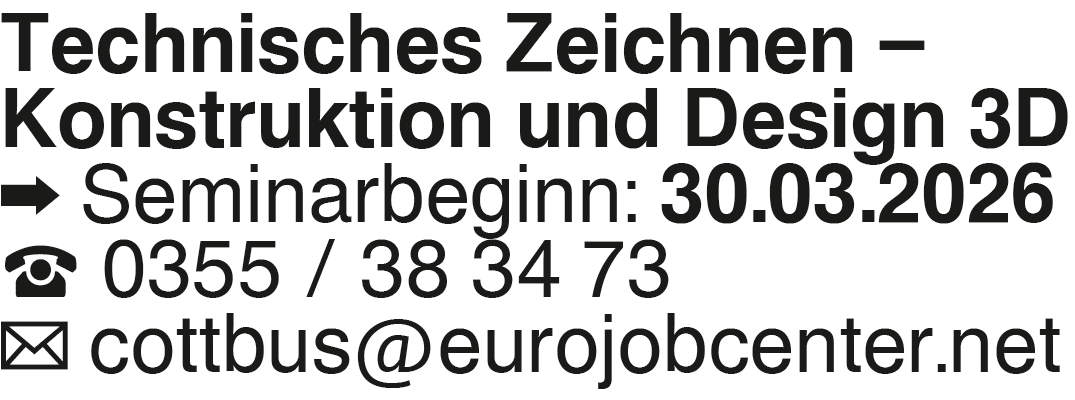 Technisches Zeichnen # Konstruktion Technisches Zeichnen # Konstruktion und Design 3D Seminarbeginn: 30.03.2026 0355 / 38 34 73 cottbus@eurojobcenter.netKontakt