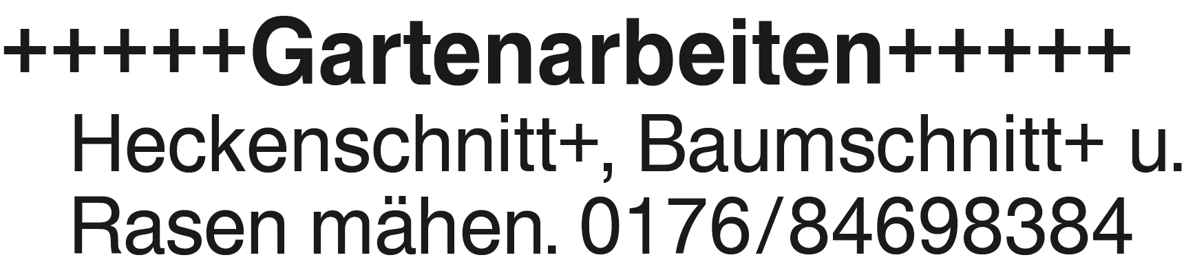 +++++Gartenarbeiten+++++ +++++Gartenarbeiten+++++ Heckenschnitt+, Baumschnitt+ u. Rasen mähen. 0176/84698384Das könnte Sie auch interessieren