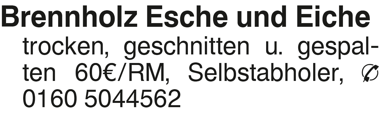 Brennholz Esche und Eiche Brennholz Esche und Eiche trocken, geschnitten u. gespalten 60 EUR/RM, Selbstabholer, 0160 5044562Das könnte Sie auch interessieren