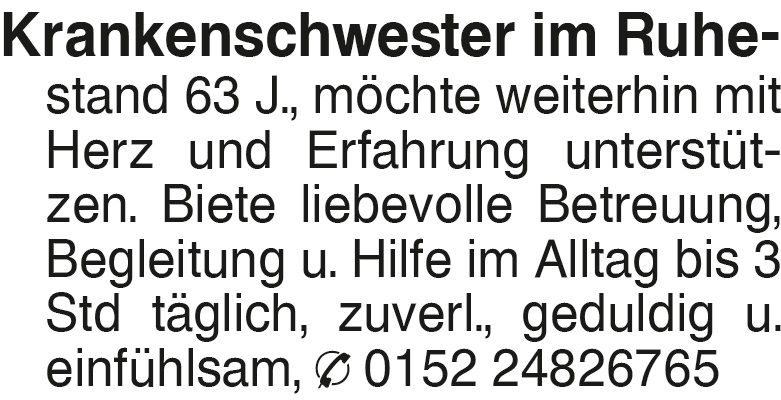 Krankenschwester im Ruhe- Krankenschwester im Ruhe- stand 63 J., möchte weiterhin mit Herz und Erfahrung unterstützen. Biete liebevolle Betreuung, Begleitung u. Hilfe im Alltag bis 3 Std täglich, zuverl., geduldig u. einfühlsam, 0152 24826765Das könnte Sie auch interessieren
