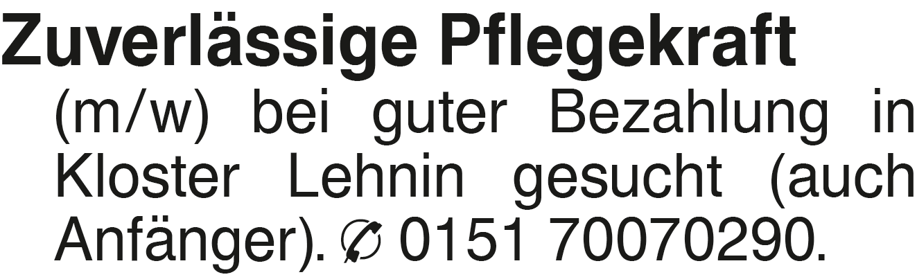 Zuverlässige Pflegekraft Zuverlässige Pflegekraft (m/w) bei guter Bezahlung in Kloster Lehnin gesucht (auch Anfänger). 0151 70070290.