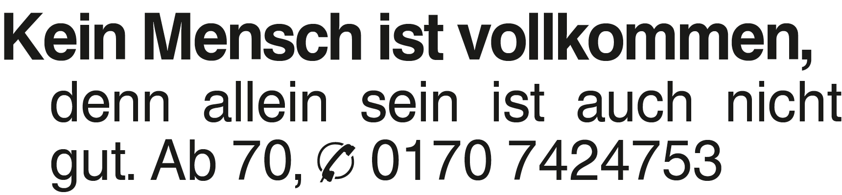 Kein Mensch ist vollkomme Kein Mensch ist vollkommen, denn allein sein ist auch nicht gut. Ab 70, 0170 7424753
