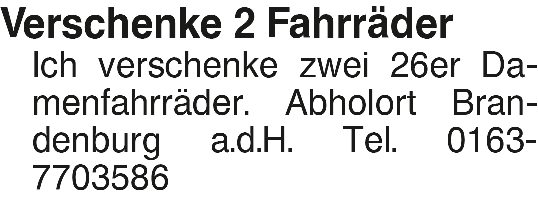 Verschenke 2 Fahrräder Ic Ich verschenke zwei 26er Damenfahrräder. Abholort Brandenburg a.d.H. Tel. 0163-7703586Kontakt