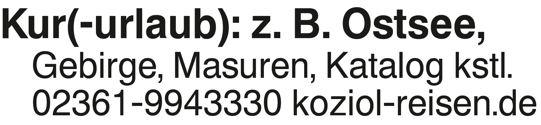 Kur(-urlaub): z. B. Ostse Kur(-urlaub): z. B. Ostsee, Gebirge, Masuren, Katalog kstl. 02361-9943330 koziol-reisen.deKontakt