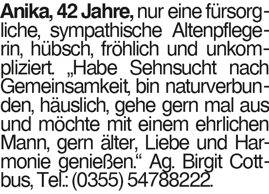 Anika, 42 Jahre Anika, 42 Jahre, nur eine fürsorgliche, sympathische Altenpflegerin, hübsch, fröhlich und unkompliziert. Habe Sehnsucht nach Gemeinsamkeit, bin naturverbunden, häuslich, gehe gern mal aus und möchte mit einem ehrlichen Mann, gern älter, Liebe und Harmonie genießen. Ag. Birgit Cottbus, Tel.: (0355) 54788222.Das könnte Sie auch interessieren
