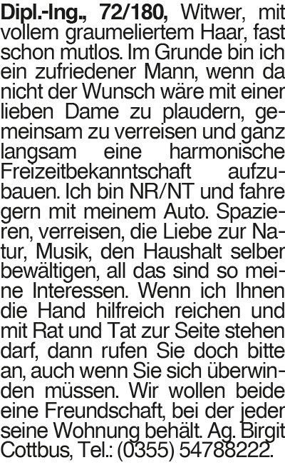 Dipl.-Ing. 72/180 Dipl.-Ing., 72/180, Witwer, mit vollem graumeliertem Haar, fast schon mutlos. Im Grunde bin ich ein zufriedener Mann, wenn da nicht der Wunsch wäre mit einer lieben Dame zu plaudern, gemeinsam zu verreisen und ganz langsam eine harmonische Freizeitbekanntschaft aufzubauen. Ich bin NR/NT und fahre gern mit meinem Auto. Spazieren, verreisen, die Liebe zur Natur, Musik, den Haushalt selber bewältigen, all das sind so meine Interessen. Wenn ich Ihnen die Hand hilfreich reichen und mit Rat und Tat zur Seite stehen darf, dann rufen Sie doch bitte an, auch wenn Sie sich überwinden müssen. Wir wollen beide eine Freundschaft, bei der jeder seine Wohnung behält. Ag. Birgit Cottbus, Tel.: (0355) 54788222.