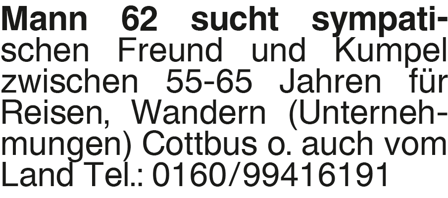 Mann 62 sucht sympatische Mann 62 sucht sympatischen Freund und Kumpel zwischen 55-65 Jahren für Reisen, Wandern (Unternehmungen) Cottbus o. auch vom Land Tel.: 0160/99416191Kontakt