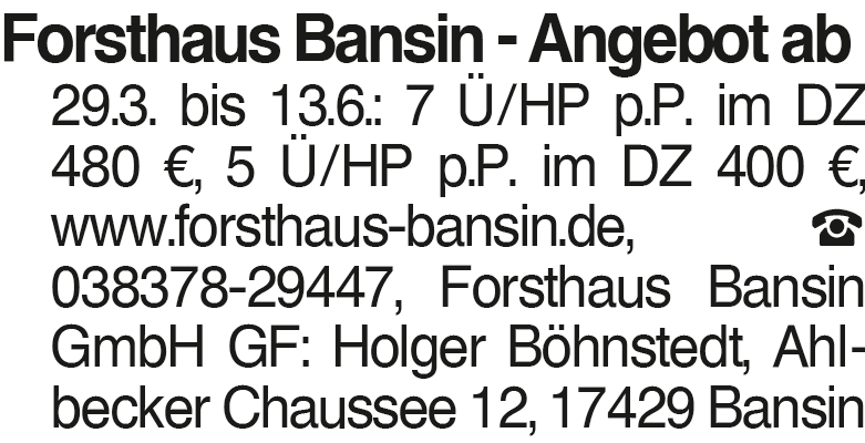 Forsthaus Bansin - Angebo Forsthaus Bansin - Angebot ab 29.3. bis 13.6.: 7 Ü/HP p.P. im DZ 480 EUR, 5 Ü/HP p.P. im DZ 400 EUR, www.forsthaus-bansin.de, 038378-29447, Forsthaus Bansin GmbH GF: Holger Böhnstedt, Ahlbecker Chaussee 12, 17429 Bansin