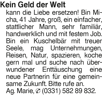 Erscheinungsdatum: Anzeige vom 14.3.2026 in der Rubrik "Ehe-/ Partnervermittlungen"