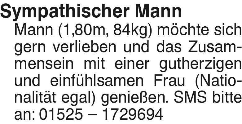 Sympathischer Mann (1,80m Sympathischer Mann Mann (1,80m, 84kg) möchte sich gern verlieben und das Zusammensein mit einer gutherzigen und einfühlsamen Frau (Nationalität egal) genießen. SMS bitte an: 01525 # 1729694Das könnte Sie auch interessieren