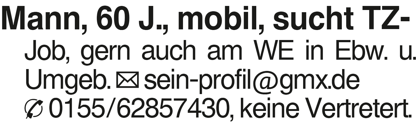 Mann, 60 J., mobil, sucht Mann, 60 J., mobil, sucht TZ- Job, gern auch am WE in Ebw. u. Umgeb. sein-profil@gmx.de 0155/62857430, keine Vertretert.Das könnte Sie auch interessieren