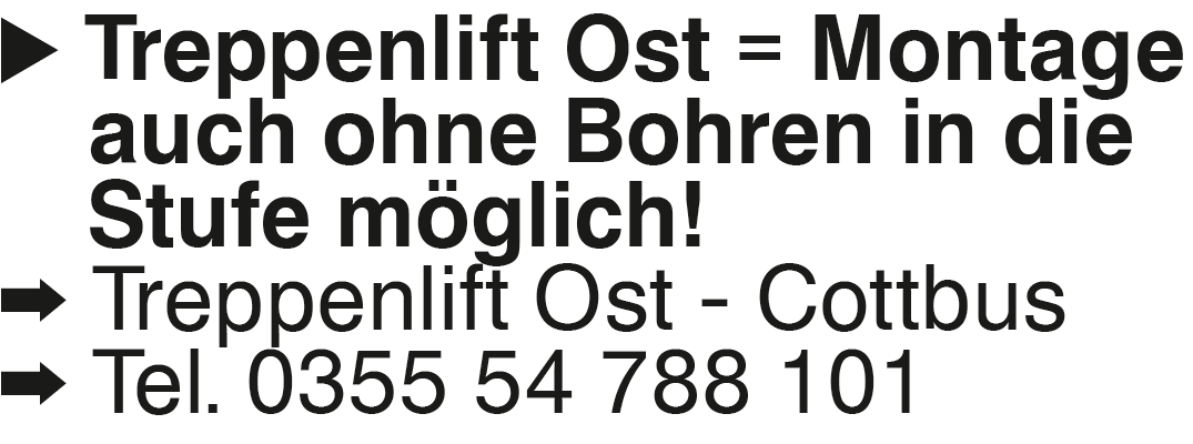 Treppenlift Ost = Montage auch ohne Treppenlift Ost = Montage auch ohne Bohren in die Stufe möglich! Treppenlift Ost - Cottbus Tel. 0355 54 788 101Das könnte Sie auch interessieren