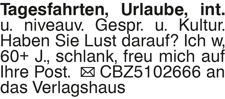 Tagesfahrten, Urlaube, in Tagesfahrten, Urlaube, int. u. niveauv. Gespr. u. Kultur. Haben Sie Lust darauf? Ich w, 60+ J., schlank, freu mich auf Ihre Post. CBZ5102666 an das Verlagshaus