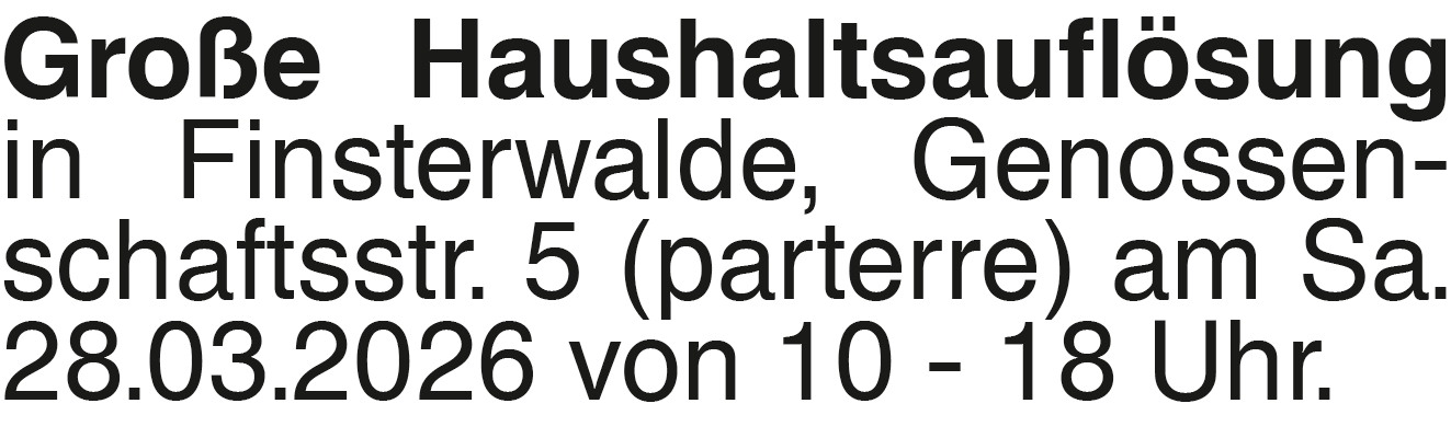 Große Haushaltsauflösung Große Haushaltsauflösung in Finsterwalde, Genossenschaftsstr. 5 (parterre) am Sa. 28.03.2026 von 10 - 18 Uhr.Das könnte Sie auch interessieren
