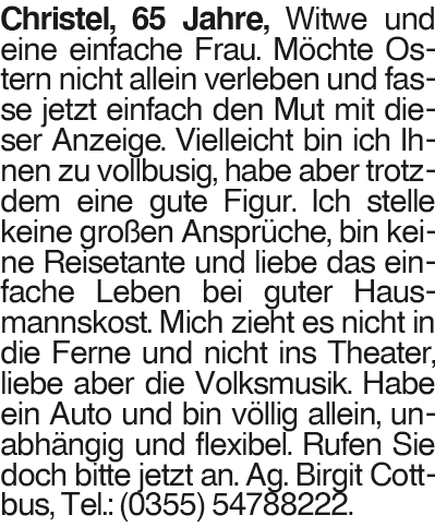 Christel, 65 Jahre Christel, 65 Jahre, Witwe und eine einfache Frau. Möchte Ostern nicht allein verleben und fasse jetzt einfach den Mut mit dieser Anzeige. Vielleicht bin ich Ihnen zu vollbusig, habe aber trotzdem eine gute Figur. Ich stelle keine großen Ansprüche, bin keine Reisetante und liebe das einfache Leben bei guter Hausmannskost. Mich zieht es nicht in die Ferne und nicht ins Theater, liebe aber die Volksmusik. Habe ein Auto und bin völlig allein, unabhängig und flexibel. Rufen Sie doch bitte jetzt an. Ag. Birgit Cottbus, Tel.: (0355) 54788222.Das könnte Sie auch interessieren