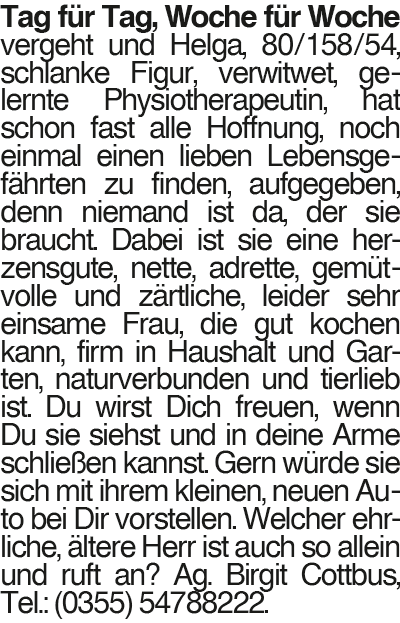 Helga, 80/158/54 Tag für Tag, Woche für Woche vergeht und Helga, 80/158/54, schlanke Figur, verwitwet, gelernte Physiotherapeutin, hat schon fast alle Hoffnung, noch einmal einen lieben Lebensgefährten zu finden, aufgegeben, denn niemand ist da, der sie braucht. Dabei ist sie eine herzensgute, nette, adrette, gemütvolle und zärtliche, leider sehr einsame Frau, die gut kochen kann, firm in Haushalt und Garten, naturverbunden und tierlieb ist. Du wirst Dich freuen, wenn Du sie siehst und in deine Arme schließen kannst. Gern würde sie sich mit ihrem kleinen, neuen Auto bei Dir vorstellen. Welcher ehrliche, ältere Herr ist auch so allein und ruft an? Ag. Birgit Cottbus, Tel.: (0355) 54788222.Das könnte Sie auch interessieren