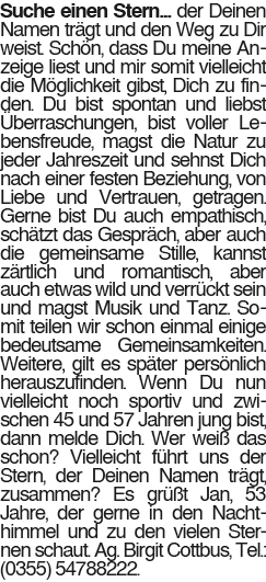 Jan, 53 Jahre Suche einen Stern... der Deinen Namen trägt und den Weg zu Dir weist. Schön, dass Du meine Anzeige liest und mir somit vielleicht die Möglichkeit gibst, Dich zu finden. Du bist spontan und liebst Überraschungen, bist voller Lebensfreude, magst die Natur zu jeder Jahreszeit und sehnst Dich nach einer festen Beziehung, von Liebe und Vertrauen, getragen. Gerne bist Du auch empathisch, schätzt das Gespräch, aber auch die gemeinsame Stille, kannst zärtlich und romantisch, aber auch etwas wild und verrückt sein und magst Musik und Tanz. Somit teilen wir schon einmal einige bedeutsame Gemeinsamkeiten. Weitere, gilt es später persönlich herauszufinden. Wenn Du nun vielleicht noch sportiv und zwischen 45 und 57 Jahren jung bist, dann melde Dich. Wer weiß das schon? Vielleicht führt uns der Stern, der Deinen Namen trägt, zusammen? Es grüßt Jan, 53 Jahre, der gerne in den Nachthimmel und zu den vielen Sternen schaut. Ag. Birgit Cottbus, Tel.: (0355) 54788222.