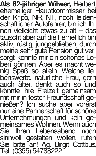 Herbert, 82 Jahre Als 82-jähriger Witwer, Herbert, ehemaliger Hauptkommissar bei der Kripo, NR, NT, noch leidenschaftlicher Autofahrer, bin ich Ihnen vielleicht etwas zu alt # das täuscht aber auf die Ferne! Ich bin aktiv, rüstig, junggeblieben, durch meine sehr gute Pension gut versorgt, könnte mir ein schönes Leben gönnen. Aber es macht wenig Spaß so allein. Welche liebenswerte, natürliche Frau, gern auch älter, denkt auch so und könnte ihre Freizeit gemeinsam mit mir in fester Freundschaft genießen? Ich suche aber vorerst nur eine Partnerschaft für schöne Unternehmungen und kein gemeinsames Wohnen. Wenn auch Sie Ihren Lebensabend noch sinnvoll gestalten wollen, rufen Sie bitte an! Ag. Birgit Cottbus, Tel.: (0355) 54788222.Das könnte Sie auch interessieren