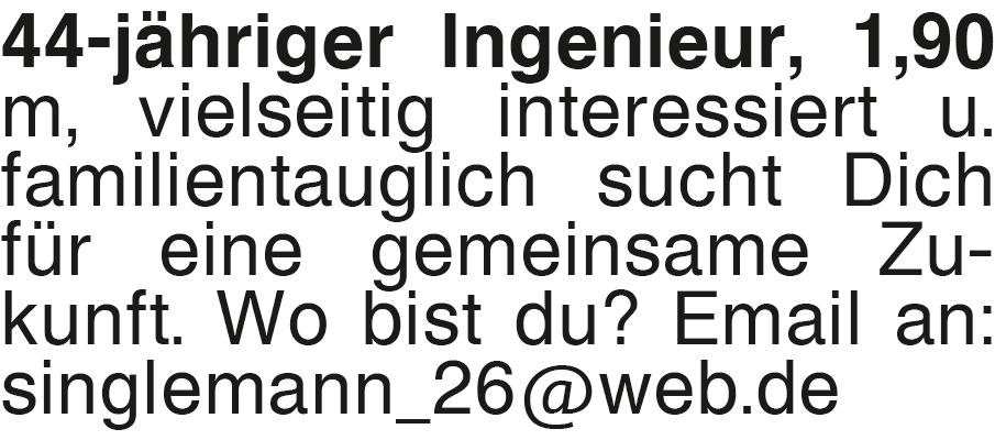 44-jähriger Ingenieur, 1, 44-jähriger Ingenieur, 1,90 m, vielseitig interessiert u. familientauglich sucht Dich für eine gemeinsame Zukunft. Wo bist du? Email an: singlemann_26@web.deDas könnte Sie auch interessieren