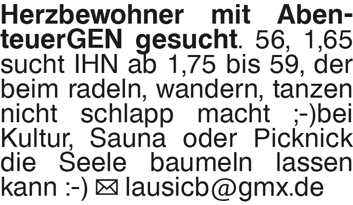 Herzbewohner mit Abenteue 56, 1,65 sucht IHN ab 1,75 bis 59, der beim radeln, wandern, tanzen nicht schlapp macht ;-) bei Kultur, Sauna oder Picknick die Seele baumeln lassen kann. Anwort erwünscht lausicb@gmx.deDas könnte Sie auch interessieren