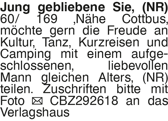 Jung gebliebene Sie, (NR) 60/ 169 ,Nähe Cottbus, möchte gern die Freude an Kultur, Tanz, Kurzreisen und Camping mit einem aufgeschlossenen, liebevollen Mann gleichen Alters, (NR) teilen. Zuschriften bitte mit Foto