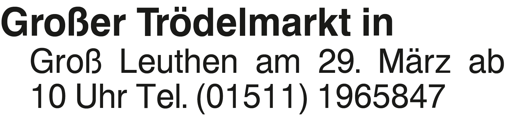 Großer Trödelmarkt in Gro Groß Leuthen am 29. März ab 10 Uhr Tel. (01511) 1965847Das könnte Sie auch interessieren