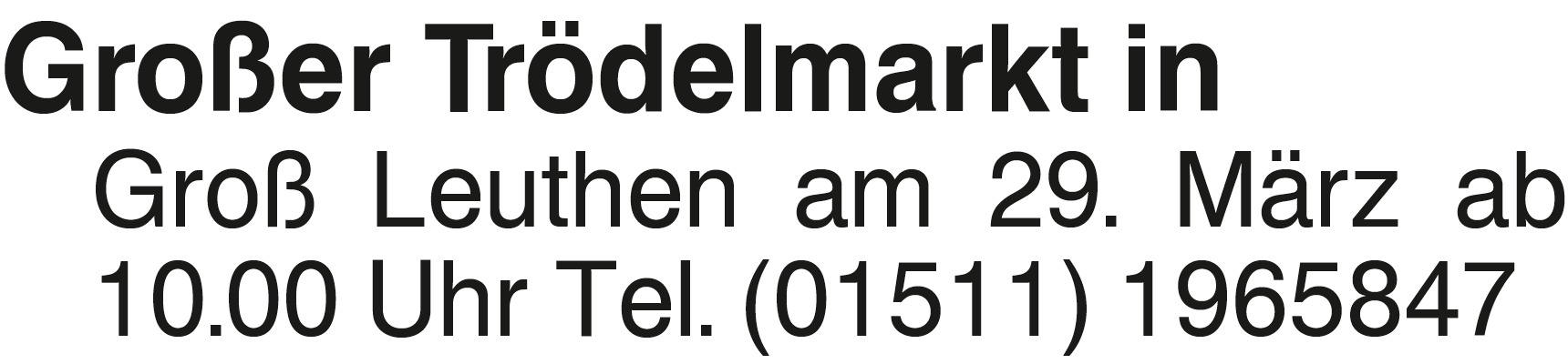 Großer Trödelmarkt in Gro Groß Leuthen am 29. März ab 10.00 Uhr Tel. (01511) 1965847Das könnte Sie auch interessieren
