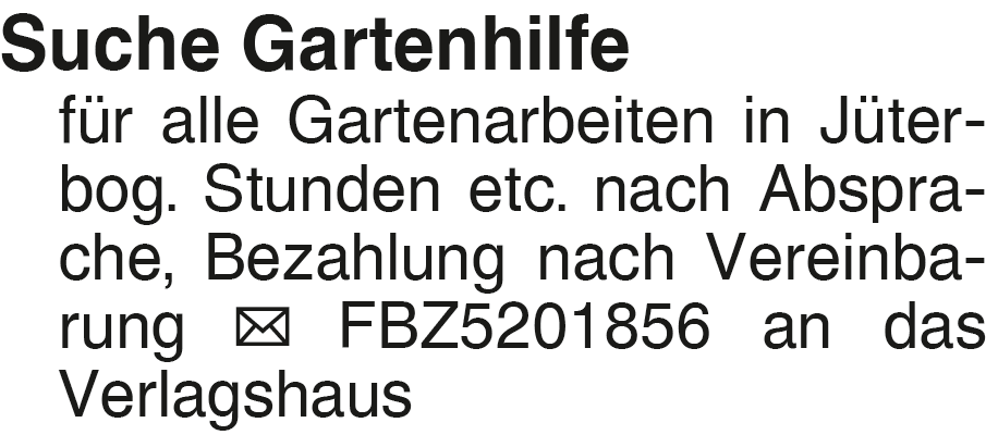 Suche Gartenhilfe für all Suche Gartenhilfe für alle Gartenarbeiten in Jüter- bog. Stunden etc. nach Absprache, Bezahlung nach Vereinbarung FBZ5201856 an das VerlagshausDas könnte Sie auch interessieren