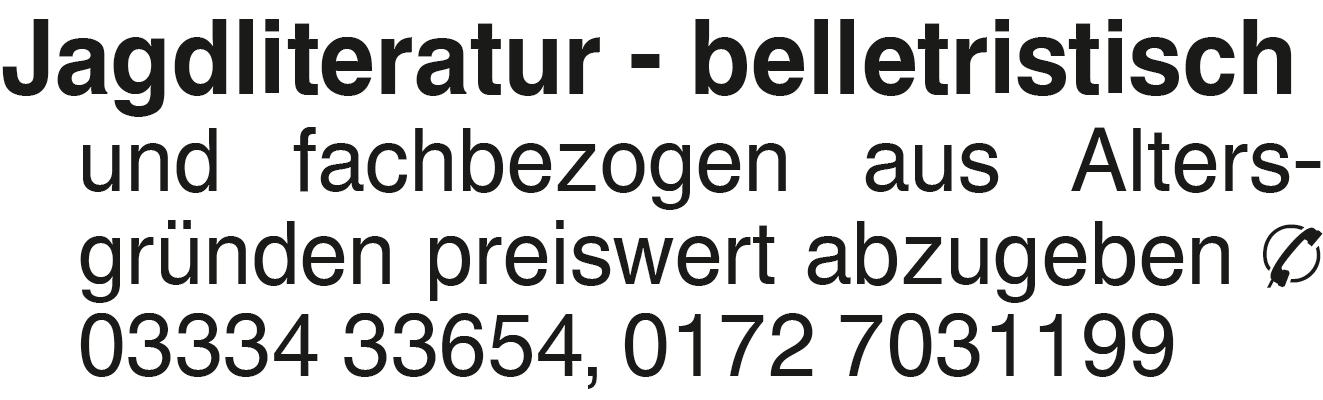 Jagdliteratur- belletrist Jagdliteratur - belletristisch und fachbezogen aus Altersgründen preiswert abzugeben 03334 33654, 0172 7031199Das könnte Sie auch interessieren