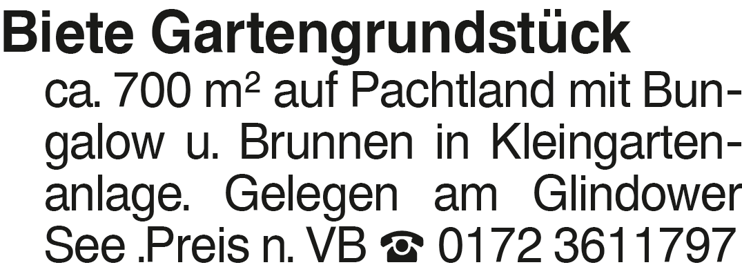 Biete Gartengrundstück ca Biete Gartengrundstück ca. 700 m2 auf Pachtland mit Bungalow u. Brunnen in Kleingartenanlage. Gelegen am Glindower See .Preis n. VB 0172 3611797Das könnte Sie auch interessieren