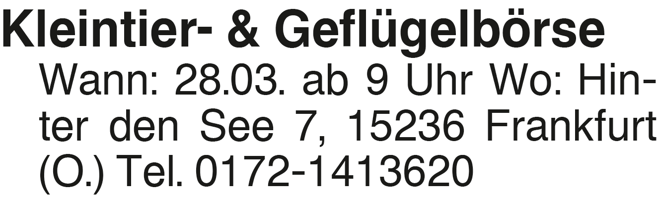 Kleintier- & Geflügelbörs Wann: 28.03. ab 9 Uhr Wo: Hinter den See 7, 15236 Frankfurt (O.) Tel. 0172-1413620Das könnte Sie auch interessieren