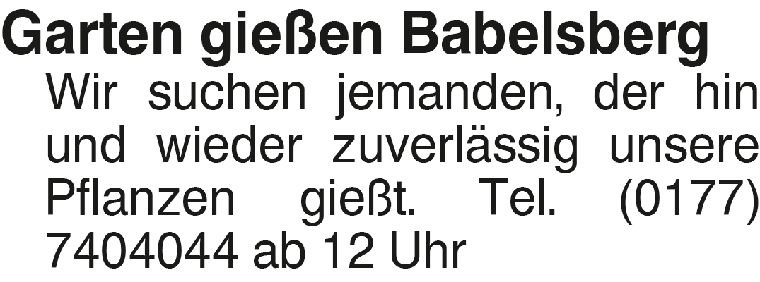 Garten gießen Babelsberg Wir suchen jemanden, der hin und wieder zuverlässig unsere Pflanzen gießt. Tel. (0177) 7404044 ab 12 UhrDas könnte Sie auch interessieren