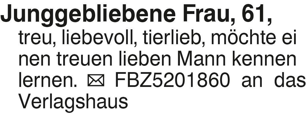 Junggebliebene Frau, 61, Junggebliebene Frau, 61, treu, liebevoll, tierlieb, möchte ei nen treuen lieben Mann kennen lernen. FBZ5201860 an das VerlagshausDas könnte Sie auch interessieren