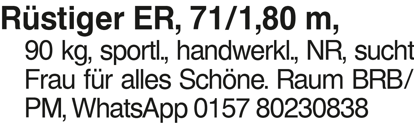 Rüstiger ER, 71/1,80 m, 9 Rüstiger ER, 71/1,80 m, 90 kg, sportl., handwerkl., NR, sucht Frau für alles Schöne. Raum BRB/ PM, WhatsApp 0157 80230838Das könnte Sie auch interessieren