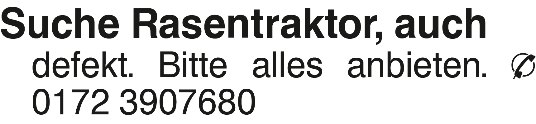 Suche Rasentraktor, auch Suche Rasentraktor, auch defekt. Bitte alles anbieten. 0172 3907680Das könnte Sie auch interessieren