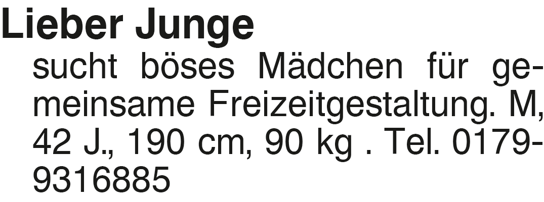 Lieber Junge sucht böses sucht böses Mädchen für gemeinsame Freizeitgestaltung. M, 42 J., 190 cm, 90 kg . Tel. 0179-9316885Das könnte Sie auch interessieren