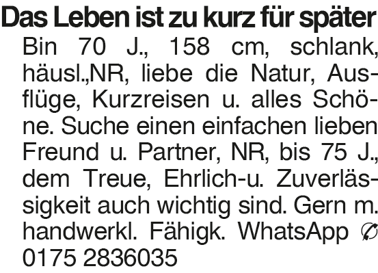 Das Leben ist zu kurz für Das Leben ist zu kurz für später Bin 70 J., 158 cm, schlank, häusl.,NR, liebe die Natur, Ausflüge, Kurzreisen u. alles Schöne. Suche einen einfachen lieben Freund u. Partner, NR, bis 75 J., dem Treue, Ehrlich-u. Zuverlässigkeit auch wichtig sind. Gern m. handwerkl. Fähigk. WhatsApp 0175 2836035Das könnte Sie auch interessieren