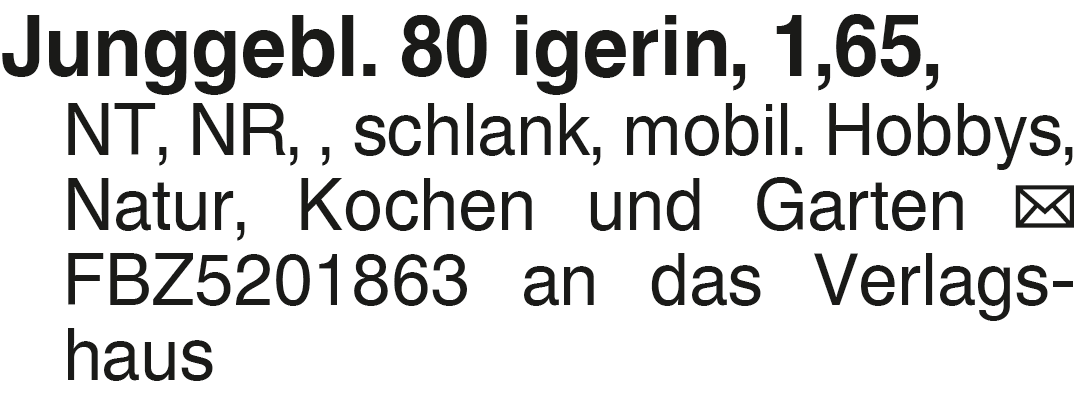 Junggebl. 80 igerin, 1,65 Junggebl. 80 igerin, 1,65, NT, NR, , schlank, mobil. Hobbys, Natur, Kochen und Garten FBZ5201863 an das VerlagshausDas könnte Sie auch interessieren