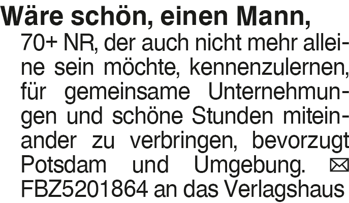Wäre schön einen Mann 70+ Wäre schön, einen Mann, 70+ NR, der auch nicht mehr alleine sein möchte, kennenzulernen, für gemeinsame Unternehmungen und schöne Stunden miteinander zu verbringen, bevorzugt Potsdam und Umgebung. FBZ5201864 an das VerlagshausDas könnte Sie auch interessieren