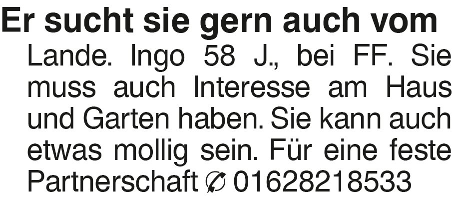 Er sucht sie gern auch vo Er sucht sie gern auch vom Lande. Ingo 58 J., bei FF. Sie muss auch Interesse am Haus und Garten haben. Sie kann auch etwas mollig sein. Für eine feste Partnerschaft 01628218533Das könnte Sie auch interessieren