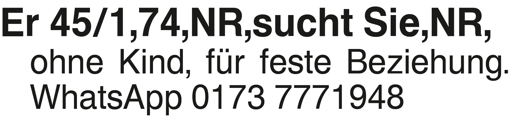 Er 45/1,74,NR,sucht Sie,N Er 45/1,74,NR,sucht Sie,NR, ohne Kind, für feste Beziehung. WhatsApp 0173 7771948Das könnte Sie auch interessieren