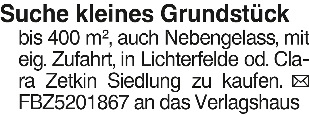 Suche kleines Grundstück Suche kleines Grundstück bis 400 m2, auch Nebengelass, mit eig. Zufahrt, in Lichterfelde od. Clara Zetkin Siedlung zu kaufen. FBZ5201867 an das VerlagshausDas könnte Sie auch interessieren