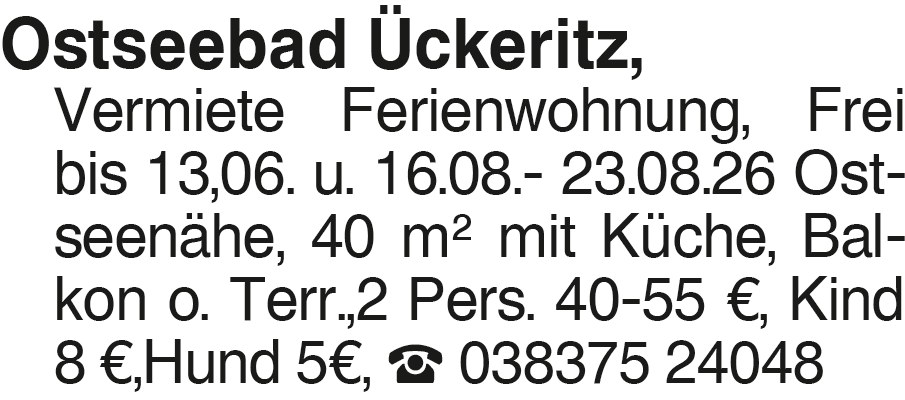 Ostseebad Ückeritz, Vermi Ostseebad Ückeritz, Vermiete Ferienwohnung, Frei bis 13,06. u. 16.08.- 23.08.26 Ostseenähe, 40 m2 mit Küche, Balkon o. Terr.,2 Pers. 40-55 EUR, Kind 8 EUR,Hund 5 EUR, 038375 24048Das könnte Sie auch interessieren
