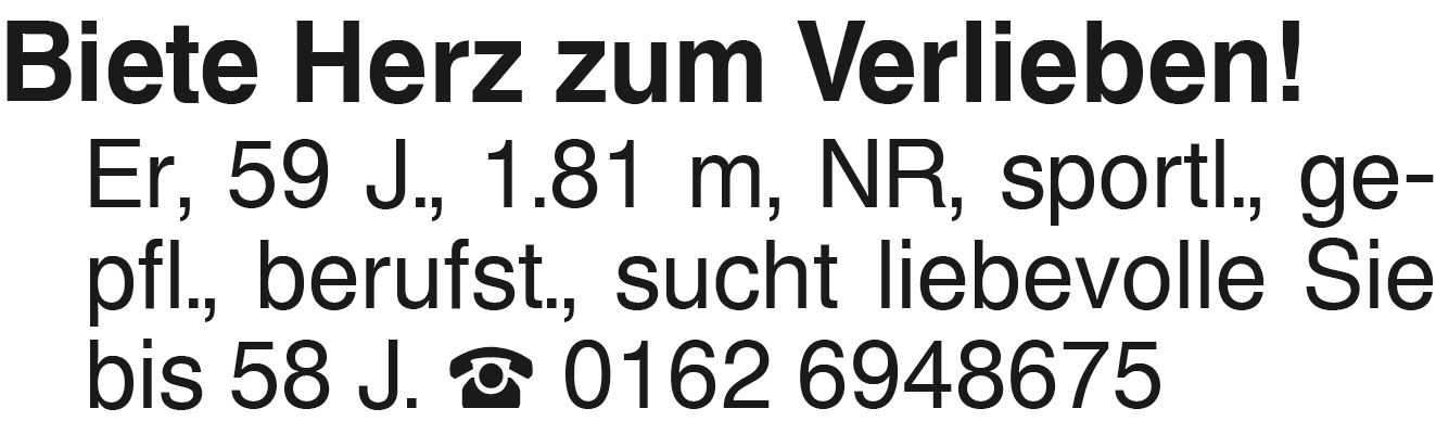 Biete Herz zum Verlieben! Biete Herz zum Verlieben! Er, 59 J., 1.81 m, NR, sportl., gepfl., berufst., sucht liebevolle Sie bis 58 J. 0162 6948675Das könnte Sie auch interessieren