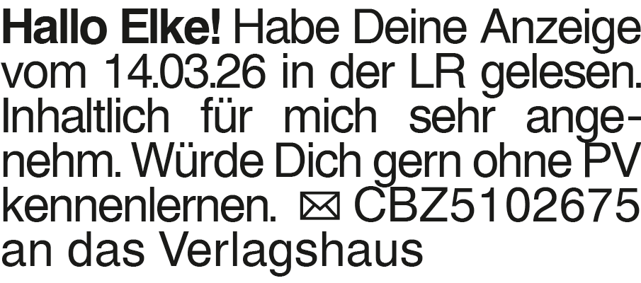 Hallo Elke! Habe Deine An Hallo Elke! Habe Deine Anzeige vom 14.03.26 in der LR gelesen. Inhaltlich für mich sehr angenehm. Würde Dich gern ohne PV kennenlernen. CBZ5102675 an das Verlagshaus