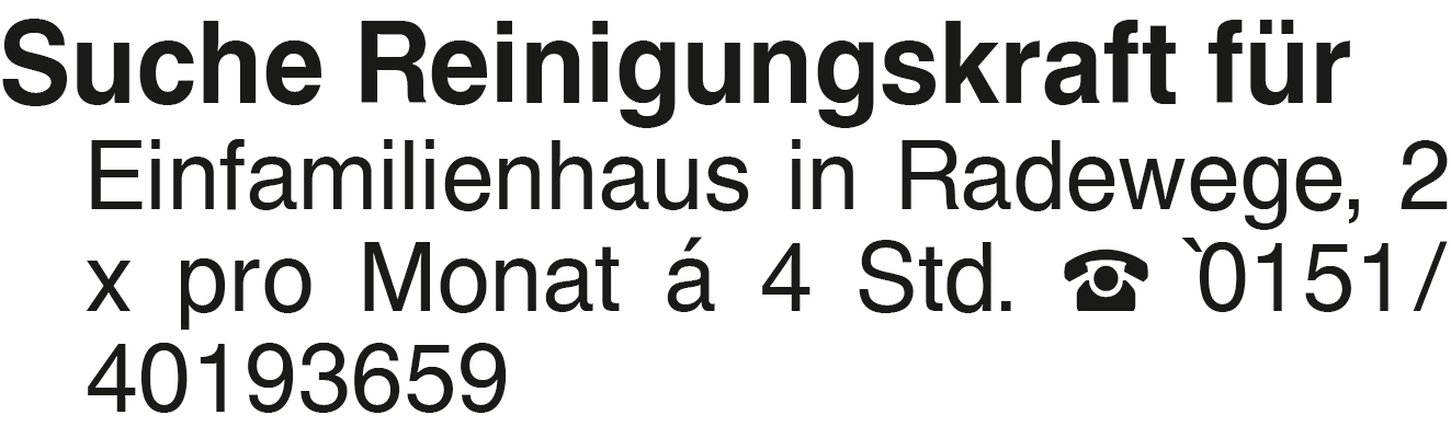 Suche Reinigungskraft für Suche Reinigungskraft für Einfamilienhaus in Radewege, 2 x pro Monat á 4 Std. `0151/40193659Kontakt