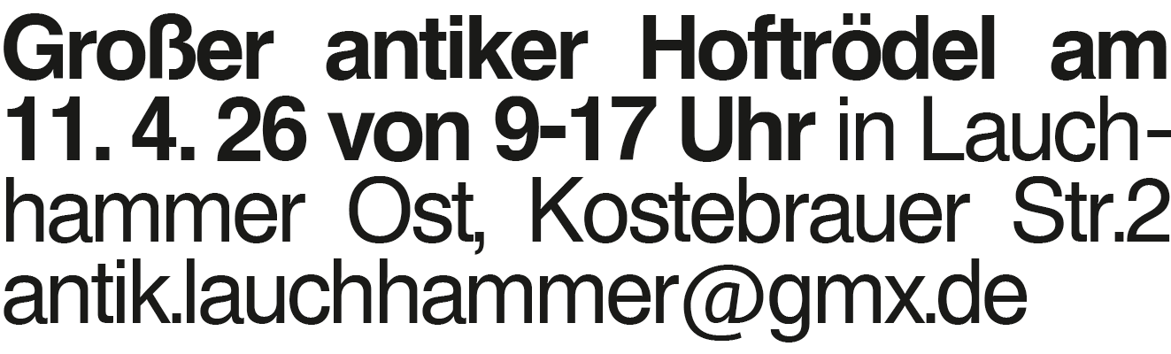 Hoftrödel am 11.4.26 Großer antiker Hoftrödel am 11. 4. 26 von 9-17 Uhr in Lauchhammer Ost, Kostebrauer Str.2 antik.lauchhammer@gmx.deDas könnte Sie auch interessieren